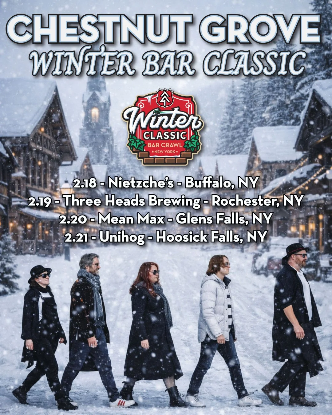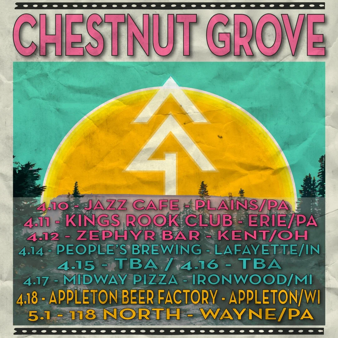 Due to the local/regional success of the band they joined the Nimbleslick roster with bands like Wild Adriatic and Consider the Source in 2017. From 2017 to the day the pandemic started in March of 2020 Chestnut Grove was playing clubs, bars, music series’s and festivals almost 3-5 nights a week. Due to financial instability, and uncertainty of when they could start touring again the band just laid low, worked on new songs and the live show until things slowly started to open back up in the summer of 2021.
